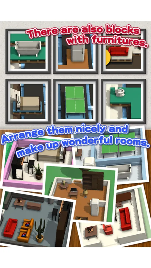 This is a puzzle game. You decorate stark rooms beautifully by putting blocks with furniture.