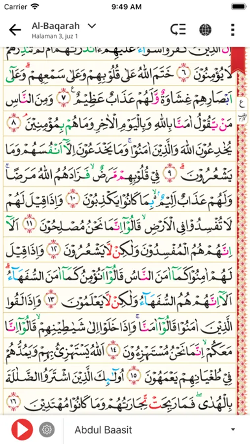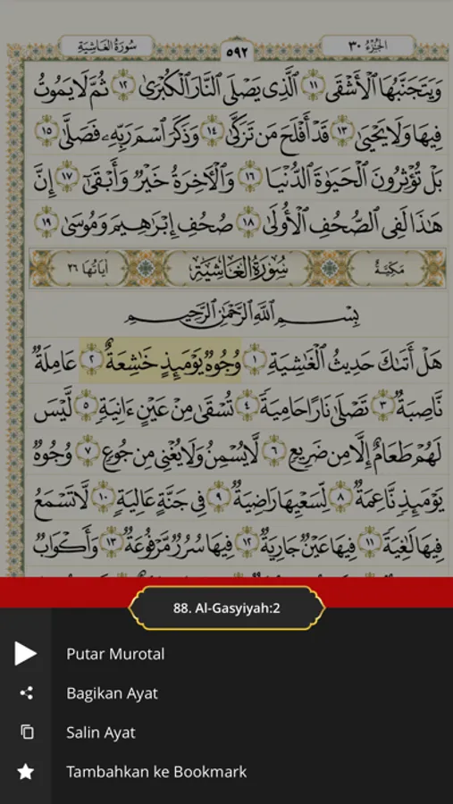 Al Quran digital dengan beragam tampilan mushaf standar Indonesia dan Madinah, per halaman, per ayat maupun per kata, dilengkapi tajwid berwarna standar Indonesia, terjemahan Bahasa Indonesia, transliterasi latin, dan audio murottal full 30 juz. Dapat dibaca offline layaknya membaca Al Quran versi cetak.
