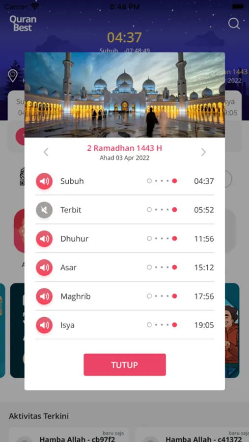 - Pengingat waktu sholat dengan perhitungan waktu mundur yang atraktif dan notifikasi adzan dari muadzin pilihan