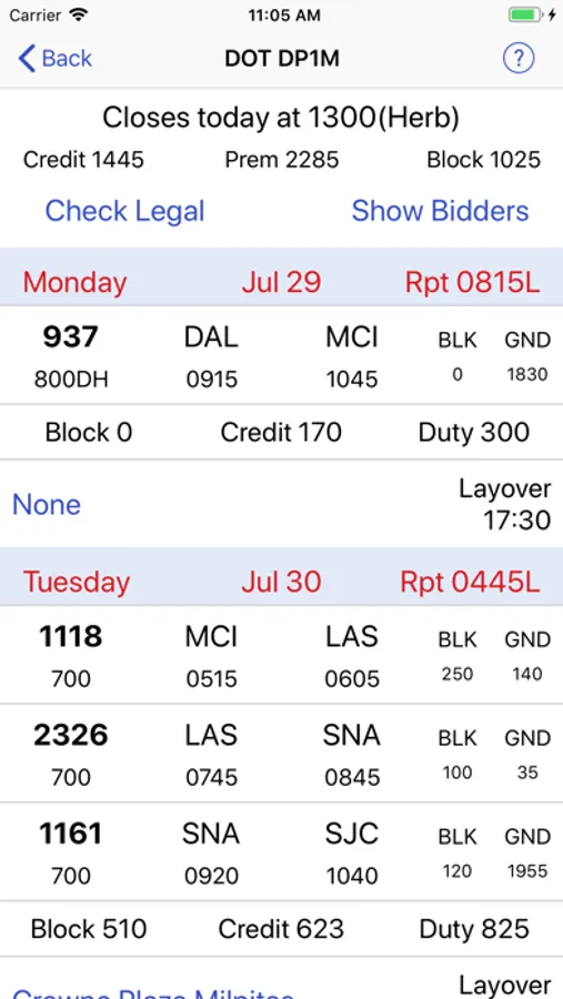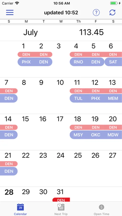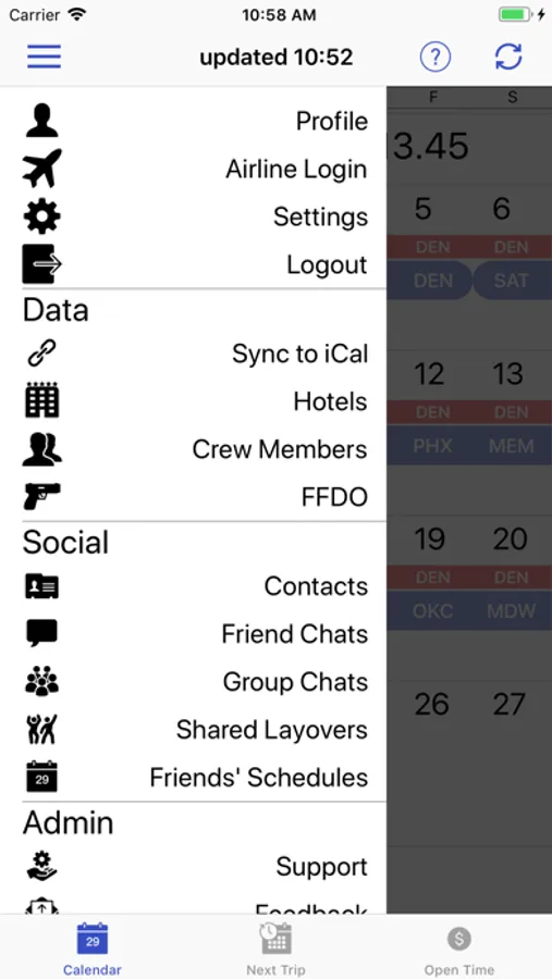 CrewZApp provides pilots and flight attendants a calendar of their schedule, trip views AND MORE with information directly loaded from their airline’s server.