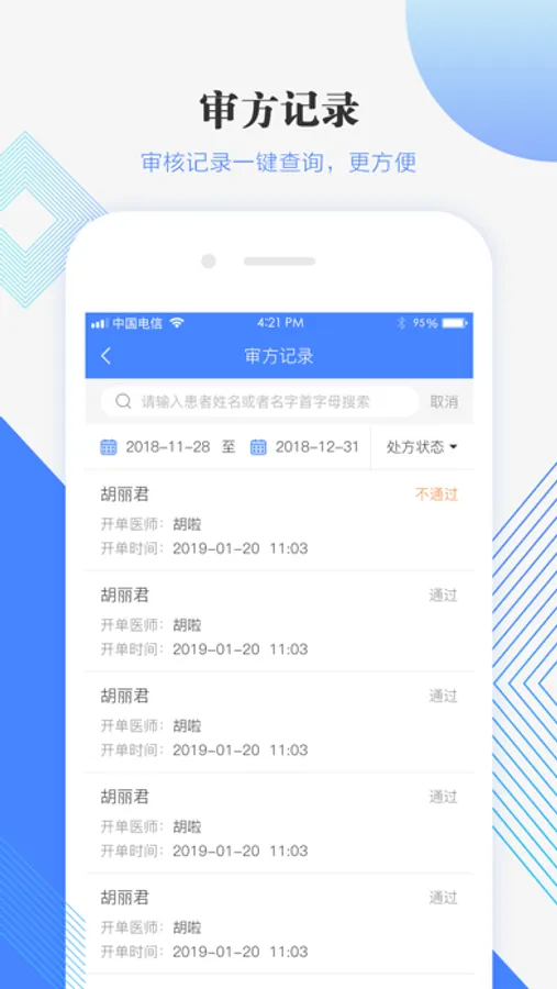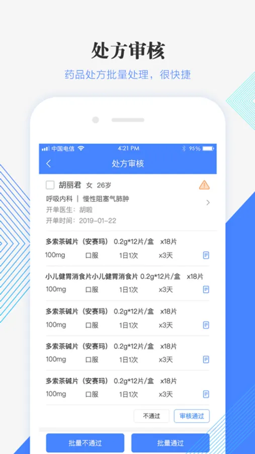 河北省胸科医院药师端app以移动互联网终端为载体,面向广大师群体,提供用药咨询、在线审方、已经药品不良事件上报等功能,为实现高效、便捷、优质的药事服务创造条件。