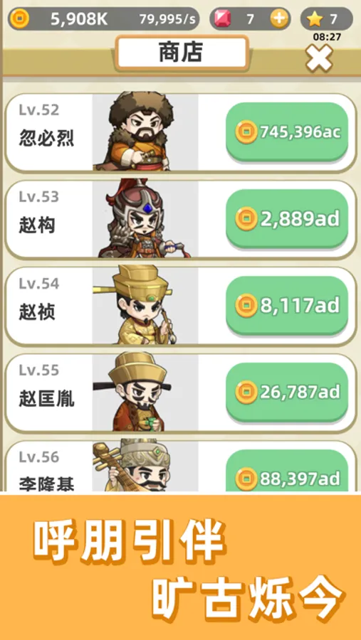 - 穿越历史,在闯关的过程中收集各路英豪,一起过关斩将。