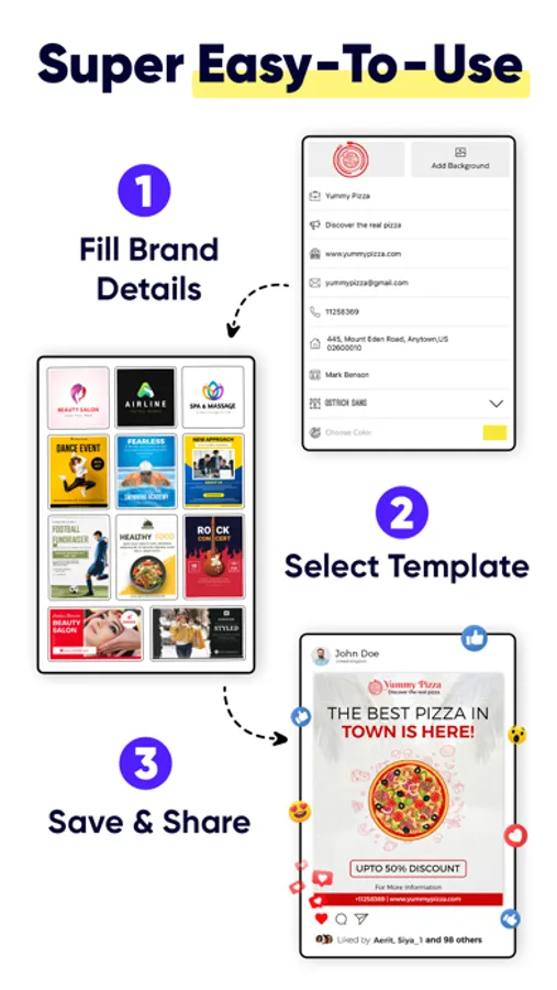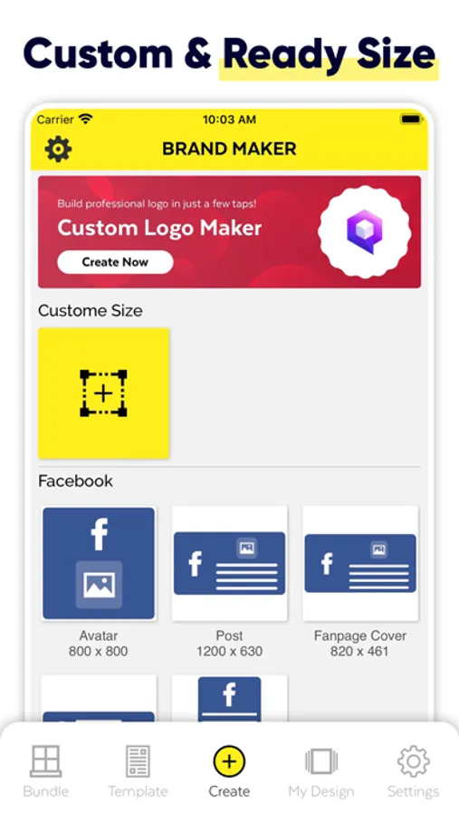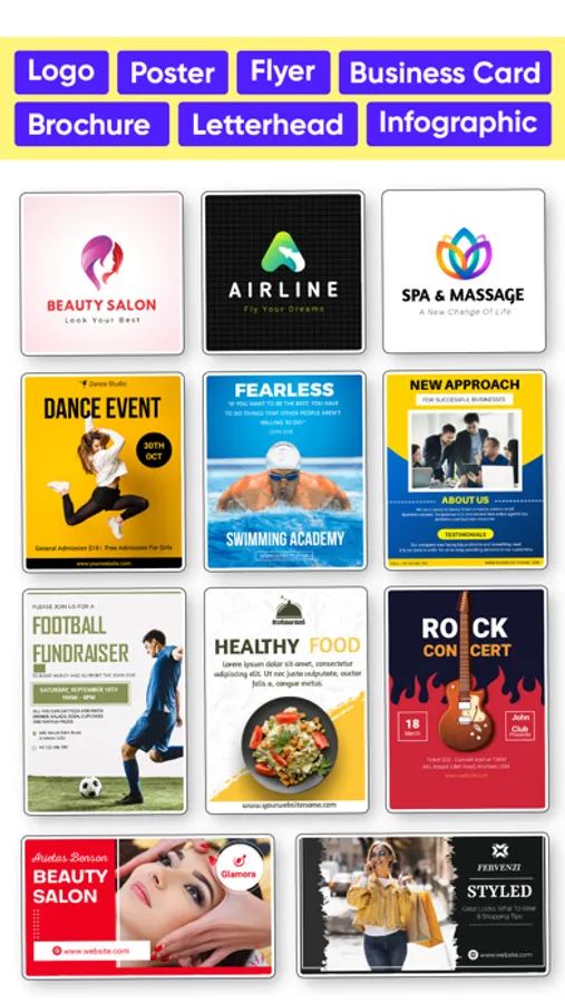 Create a logo, flyers, infographics, brochures, business cards, invitations, covers, thumbnails, posters, advertisements, Facebook posts, Instagram posts, Instagram stories, festival posters, blog banners, brand identity materials, roll banners, gift cards, photo collages, restaurant menu, presentation, letterhead design, signage and more with this logo design app.