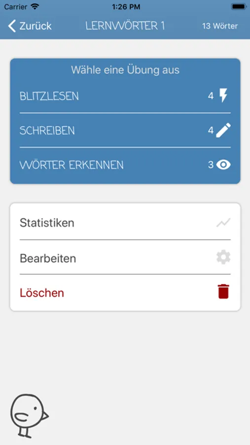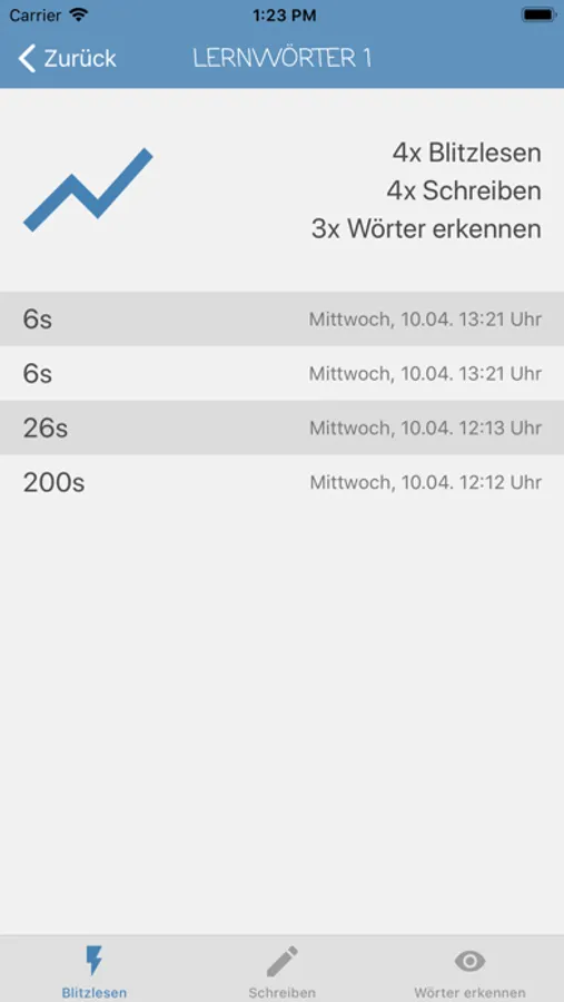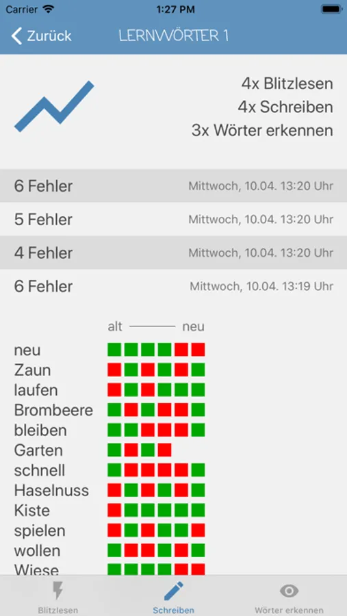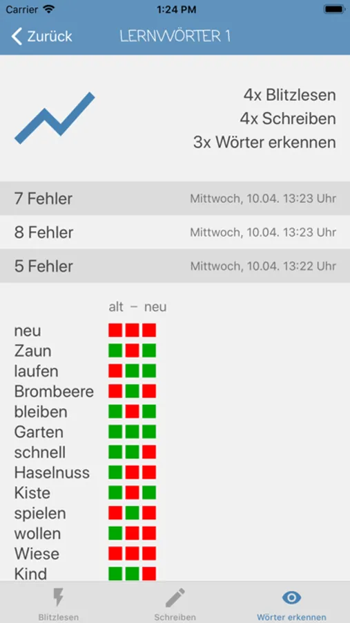 Die Lernwörter App bietet Statistiken an, mit denen man die vergangenen Leistungen und den Lernfortschritt einsehen kann. So bekommt das Kind ein positives Feedback und kann die erzielten Lernerfolge mit Hilfe der App sehen.