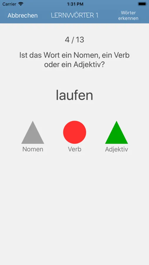 - Das Wörter Erkennen lässt die Schüler*innen die Worte in die Kategorien Nomen, Verb und Adjektiv einsortieren.