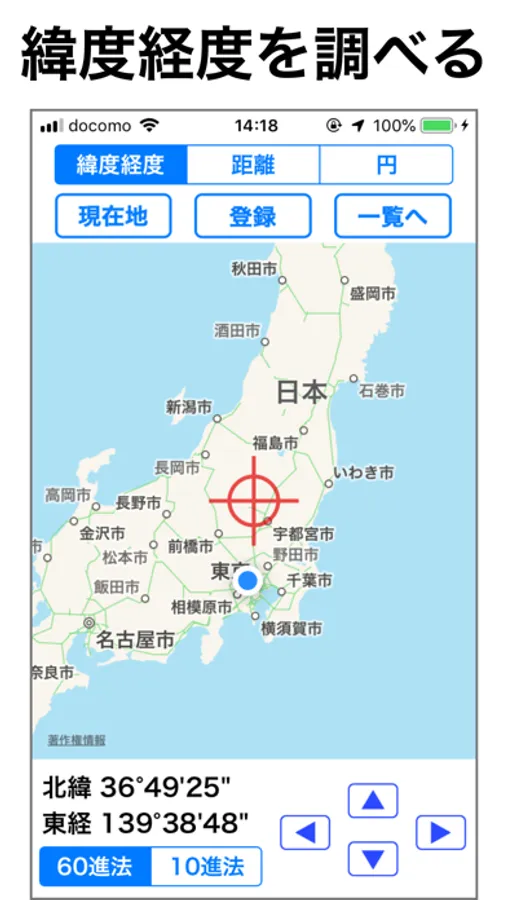 地図上の中央の地点の緯度経度を調べたり、指定した緯度経度の地点を地図の中央に表示したりします。