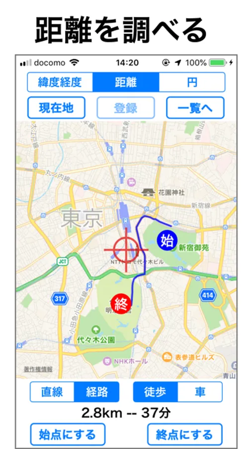 地図上に始点と終点を指定してその間の直線距離、あるいは経路の長さを調べます。