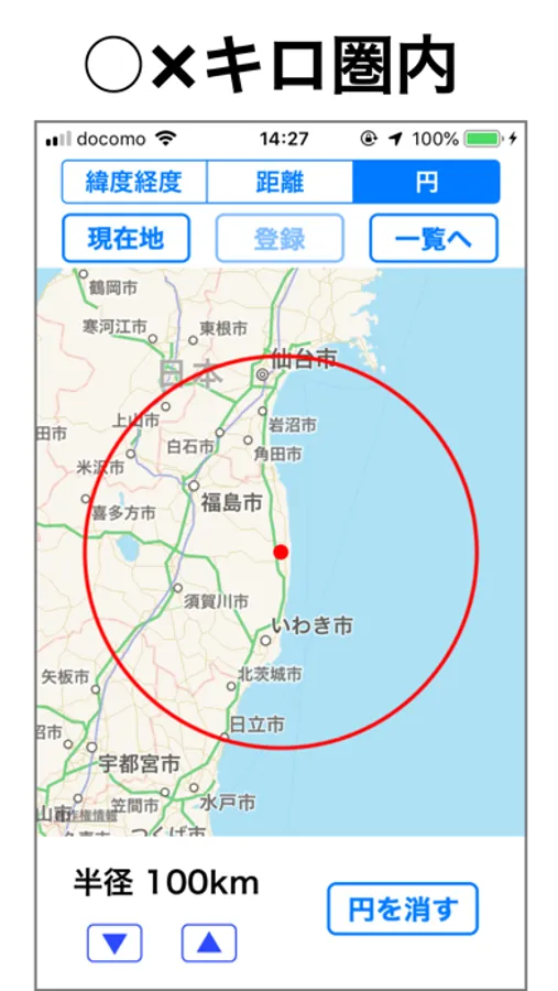 地図の中心を円の中心として指定した半径の円を地図上に描きます。原発の30キロ圏内に何があるのか・・・といったことを調べるのが目的ですが、地図がメルカトル図法なので、少し誤差があります。