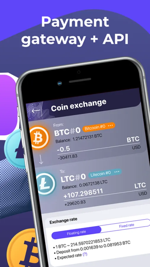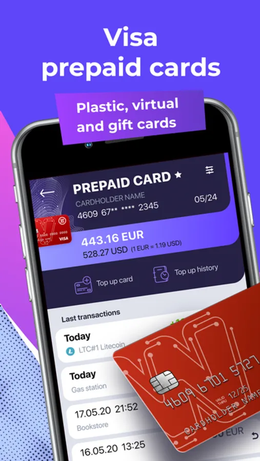 Manage all crypto and Visa card in a single app, swiftly and simply. Top up the card balance with BTC, ETH, LTC and other cryptocurrencies at favorable rates.