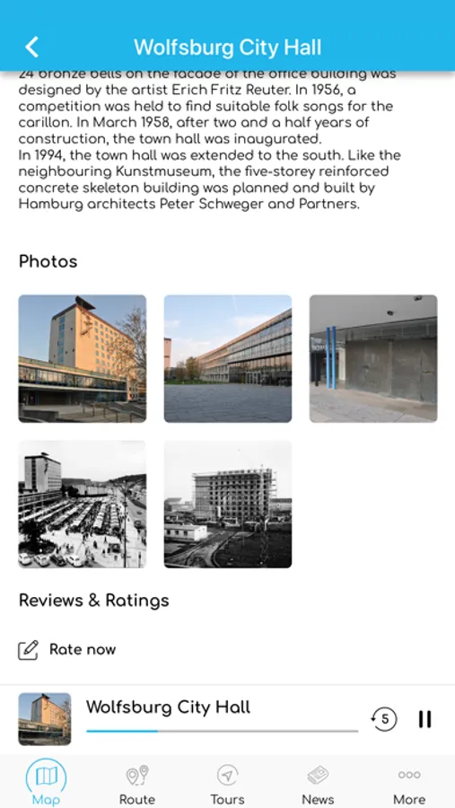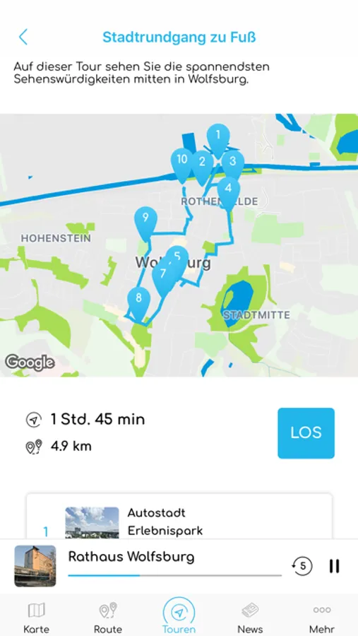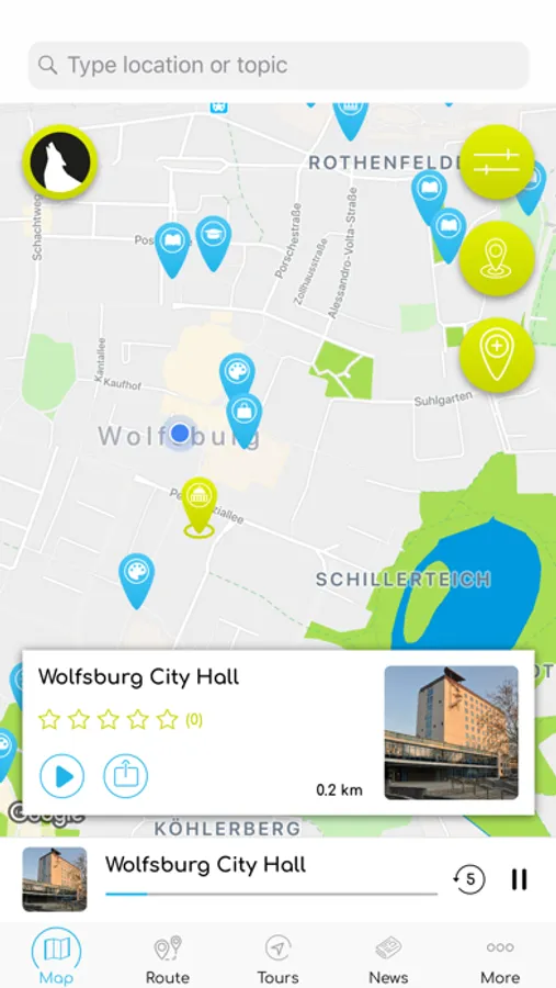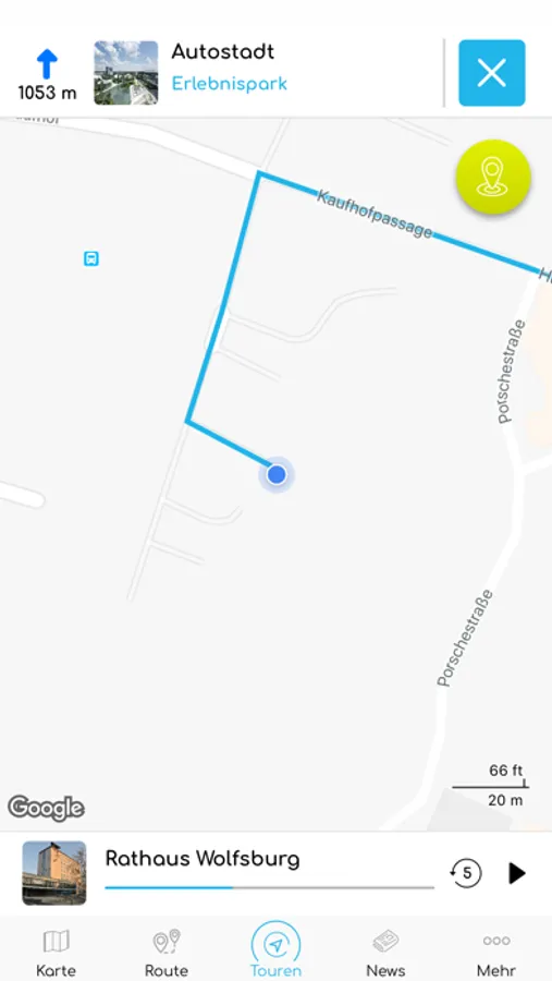 With CultureMaps, you can move around freely and navigate specifically to individual POIs or be guided along one of the tours through Wolfsburg. You will automatically hear the description as soon as you approach a place of interest.