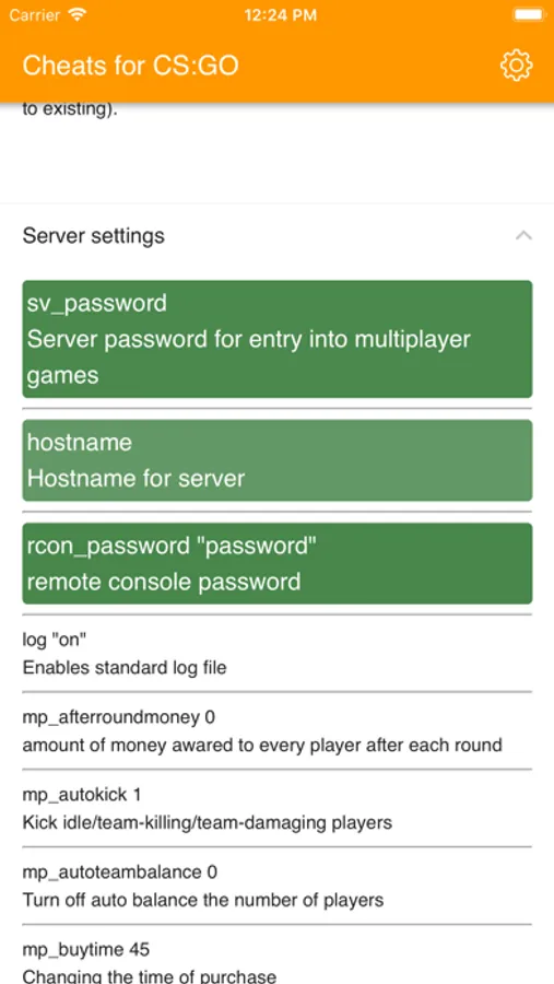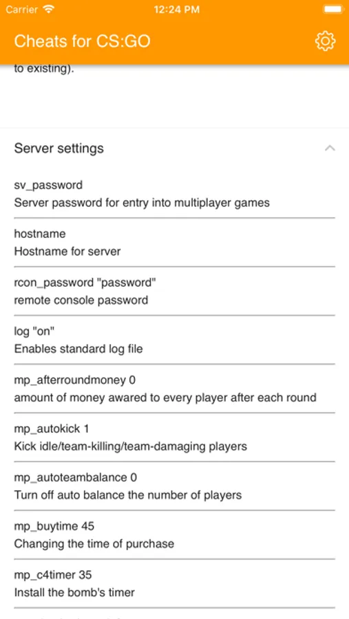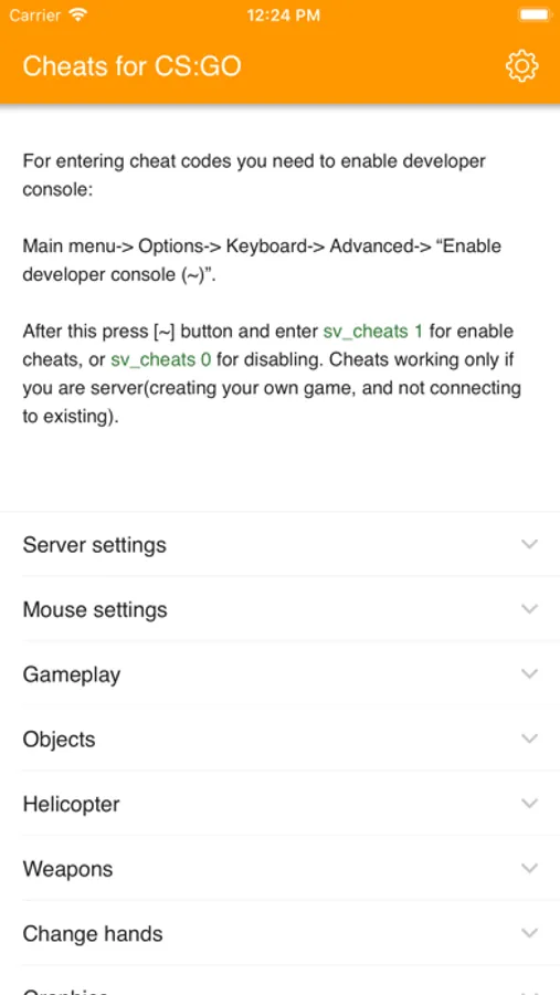 This application is a collection of cheats for CS GO. In it you can find a large number of diverse cheats codes that will allow you to gain an advantage in a network game or play a trick on your friends. For the convenience of entering cheat codes, you can highlight the cheat code you need by simply tapping on it. Have a nice game!