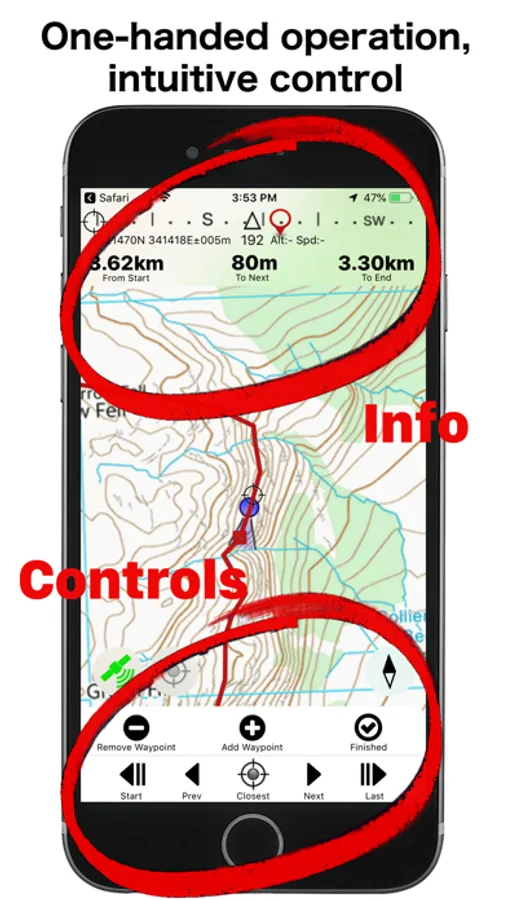 The app is build from the ground up to use the true British National Grid, not the commonly used WGS84 global approximation which doesn't give a true uniform grid. We also design from the ground up for functionality. Controls are at the bottom of the screen where you can operate them one handed without shifting your grip, and information is biased towards the top of the screen. All functionality can be accessed with a single tap from the main screen, so that there are no nested layers of menus that you have to navigate or memorise to find what you are after.