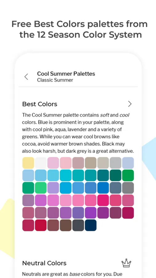 Explore the 12 Season Color System through free Best Colors palettes. Additionally, enjoy specially curated premium palettes like Complementary Colors, Neutral Colors, Jewelry, Eyeshadow Colors, and Lipstick Colors.