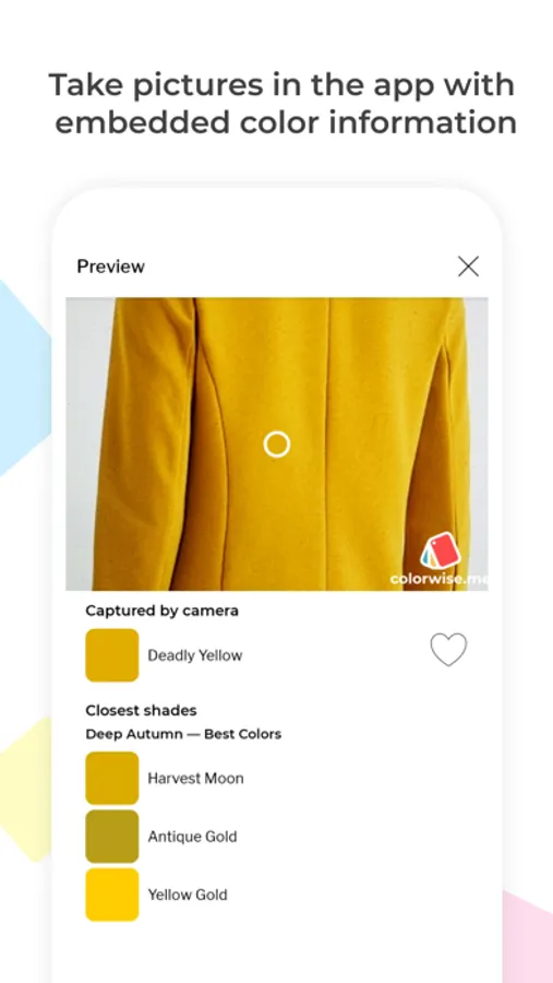 - Smart Color Picker: Instantly find colors that enhance your look. Point your camera at clothing or select a photo from your gallery.