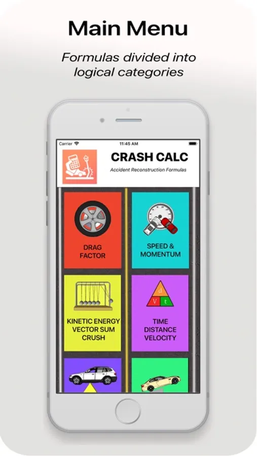 With your monthly or yearly subscription you will find Crash Calc is broken down into seven logical categories of formulas.