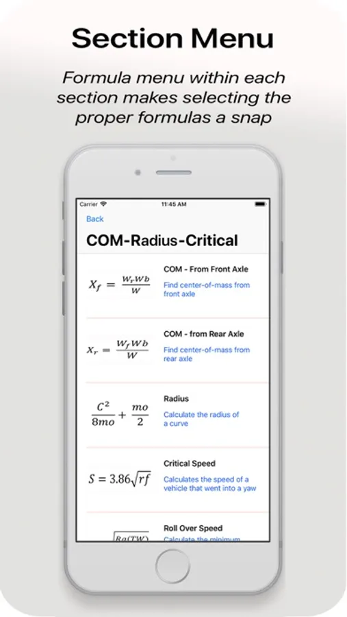 • Center-of-Mass, Radius, Critical Speed and Roll-Over – Grouped together to easily move from one formula to the next.