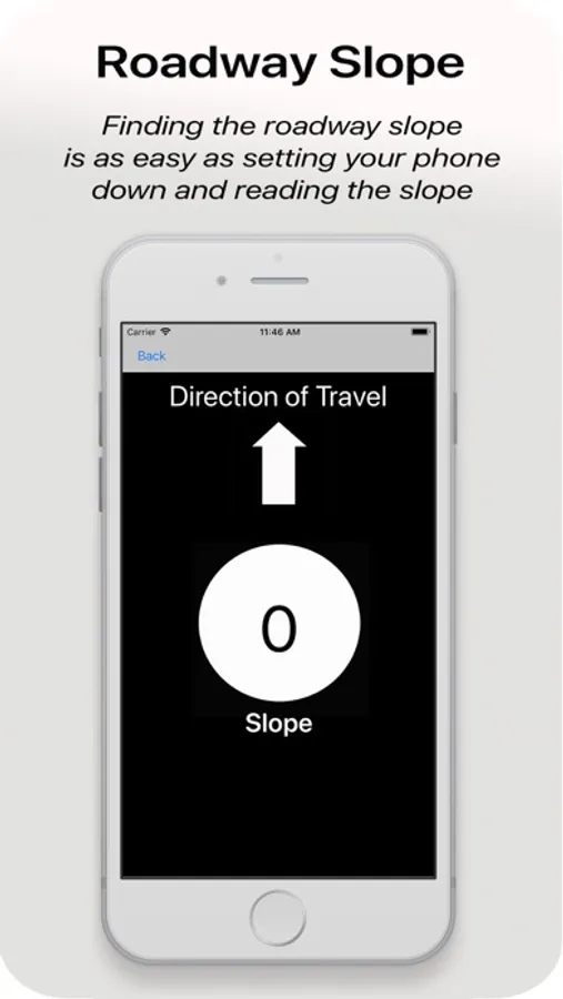 • Slope Indicator – Use this feature to easily find the slope of the roadway in question. Simply place your phone down on the roadway (or takeoff angle) in the direction of travel and instantly read the slope on your phone.