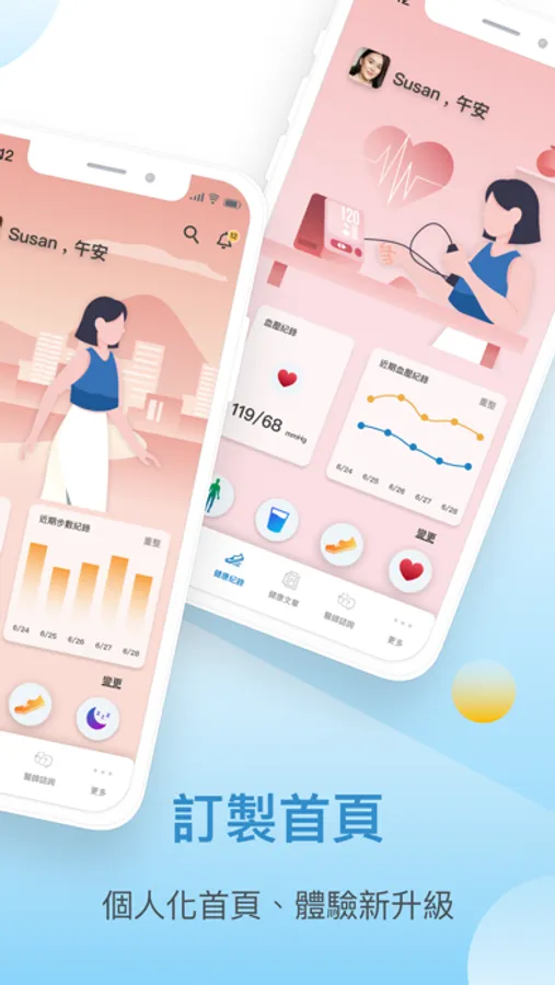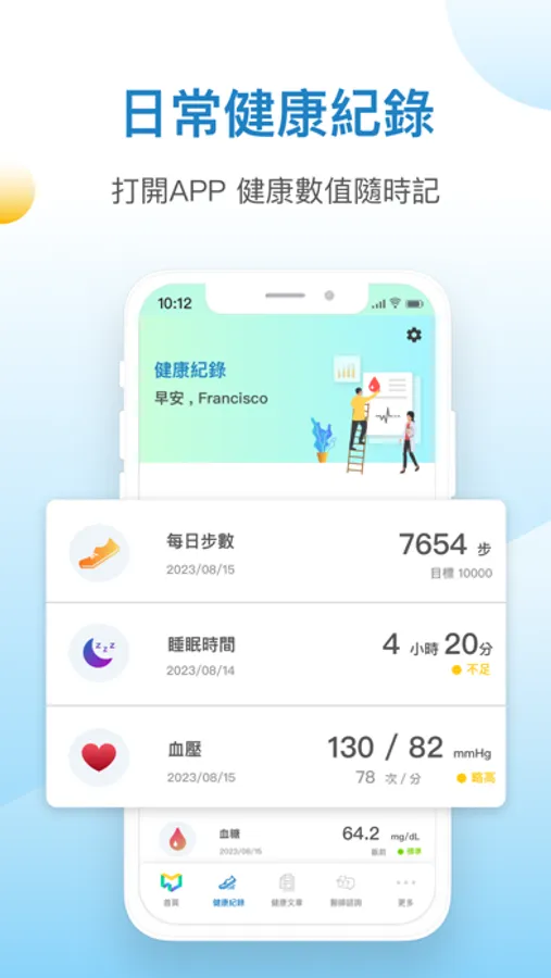 記錄每日飲水量、睡眠、步數、血壓及血糖等數據,整合iOS健康資料(Apple Health),並可預設通知、異常數值提醒等功能,幫助您輕鬆做好健康管理。