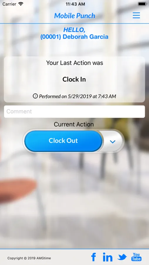 AMGtime Lite mobile app is a component of AMG Attendance System Free online system. It allows employees checking in and out remotely from pre-assigned locations using their mobile phones. Mobile punches are being transferred to the system in a real-time mode. Using this app, employees can also perform job transfers.