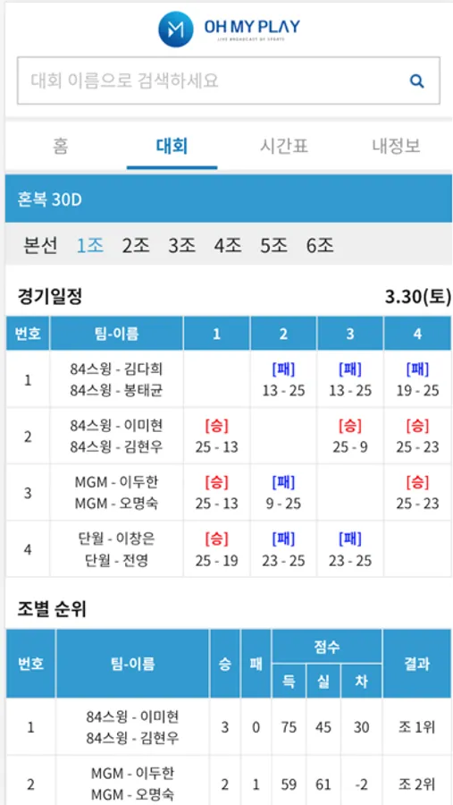 대회의 대진정보와 영상을 함께 볼 수 있습니다.