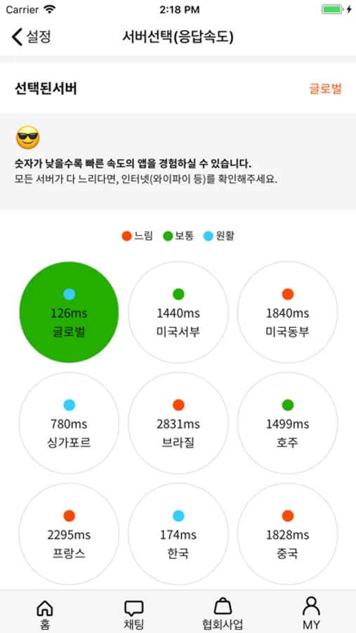 APP 속도가 느릴 경우, 현재 위치한 국가와 근접한 서버를 선택해보세요.