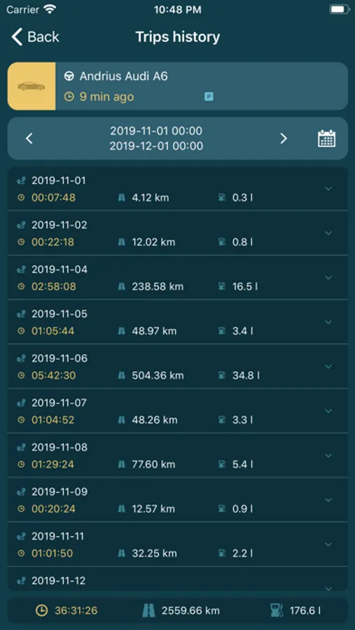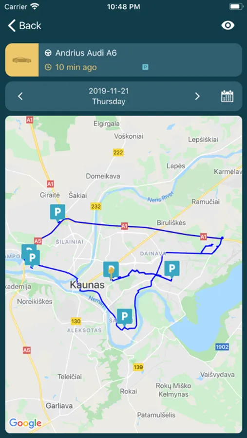 „Car In Phone Lite“ also allows you to view the vehicle's travel history for the selected time period with the following info:
