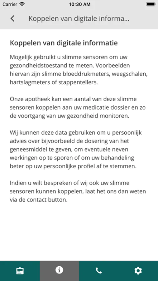 De Pharmi app biedt u op een efficiënte wijze, alle informatie omtrent uw behandeling. Kies na installatie uw behandeling en stel uw behandeldatum in. Druk vervolgens op 'Start' en uw persoonlijke tijdlijn wordt gecreëerd.