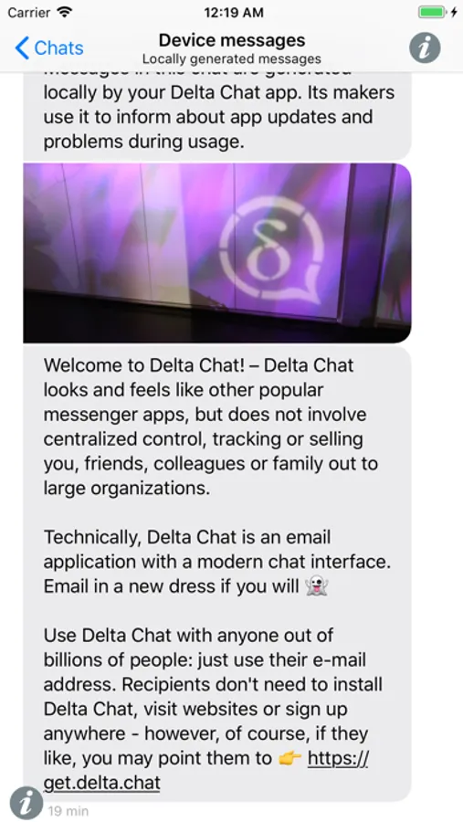 Delta Chat is a messenger that uses the largest, most diverse and decentralized communication system ever created: the existing e-mail server network. Just use your standard e-mail account and start chatting with any of your e-mail contacts, whether they have installed Delta Chat or not.