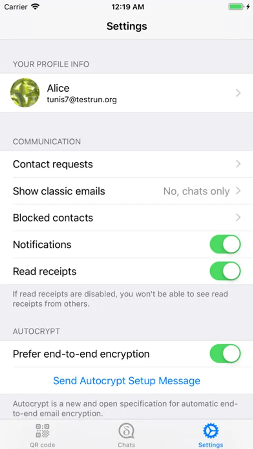Delta Chat sends e-mails using your e-mail account and provider of choice. You can change mobile numbers without any trouble or even work without any SIM card or phone number at all. End-to-end encryption is established automatically when chat partners start communicating with each other.