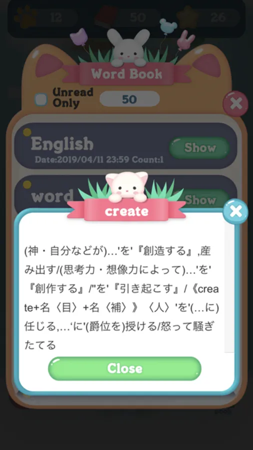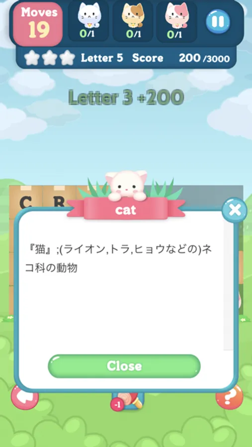 There is an explanation in Japanese for the meaning of words you found in the puzzle. So you can learn new words in both English and Japanese while playing Nekotan ^^