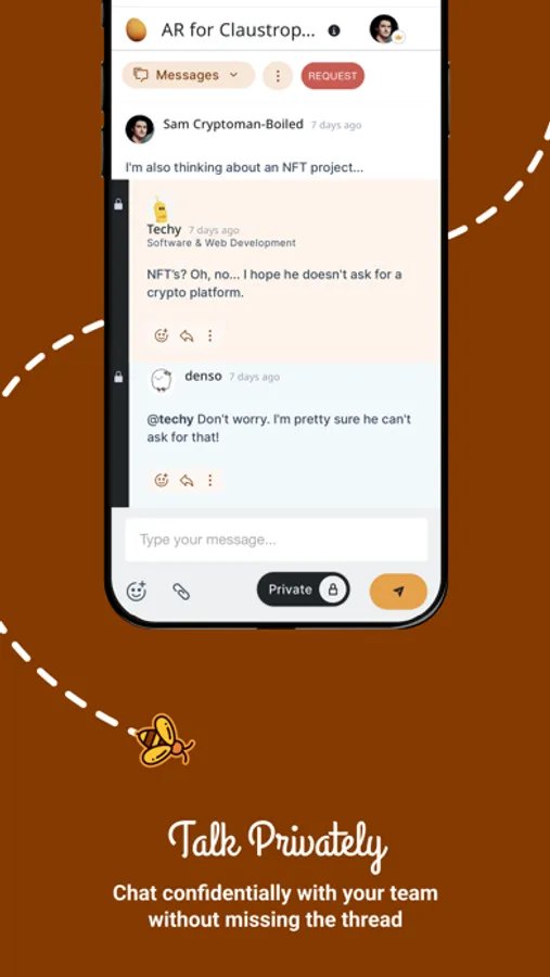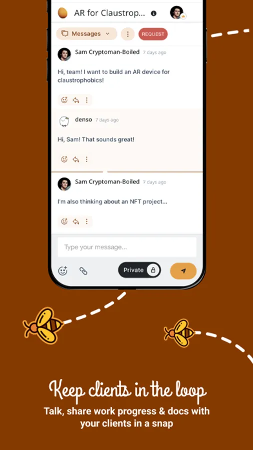 Bee offers a range of features to fuel your team productivity, allowing you to manage tasks effortlessly, communicate with clients, track time, and register project progress. Our app allows team members to chat privately in the same thread as with clients, keeping everyone in the loop without switching chats.