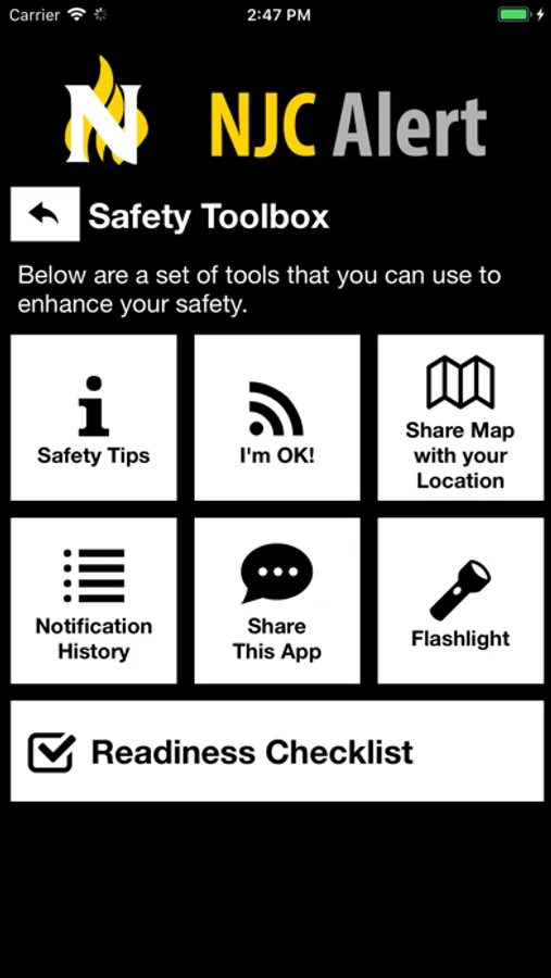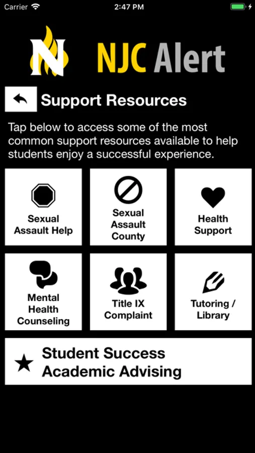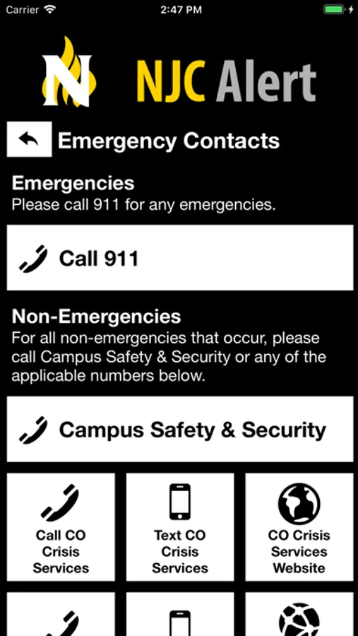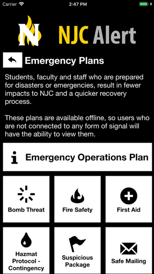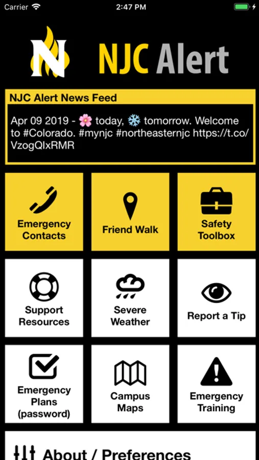 NJC Alert is the official safety app of Northeastern Junior College. It is the only app that integrates with NJC's safety and security systems. Campus Safety & Security has worked to develop a unique app that provides students, faculty and staff with added safety on the Northeastern Junior College campus. The app will send you important safety alerts and provide instant access to campus safety resources.