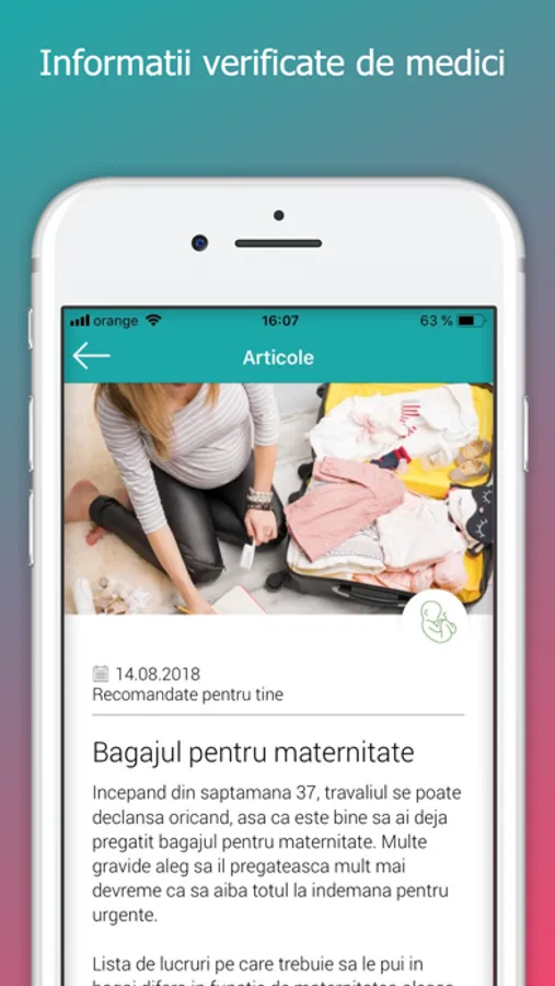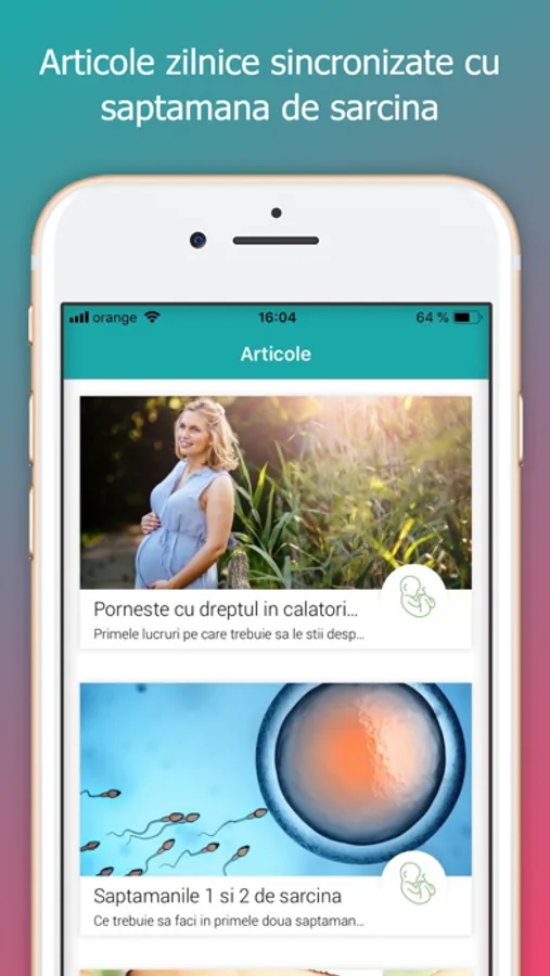 - Articole zilnice sincronizate cu saptamana de sarcina in care te afli;