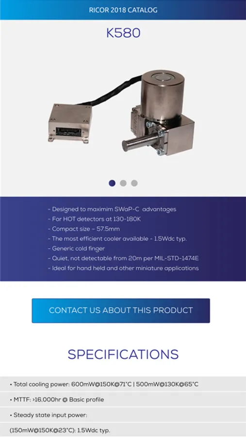 Ricor’s 2019 catalog of advanced miniature cryogenic cooling solutions including Integral Rotary, Split Rotary and Split Linear miniature cryocoolers with an easy-to-use search feature that includes technical and general search.
