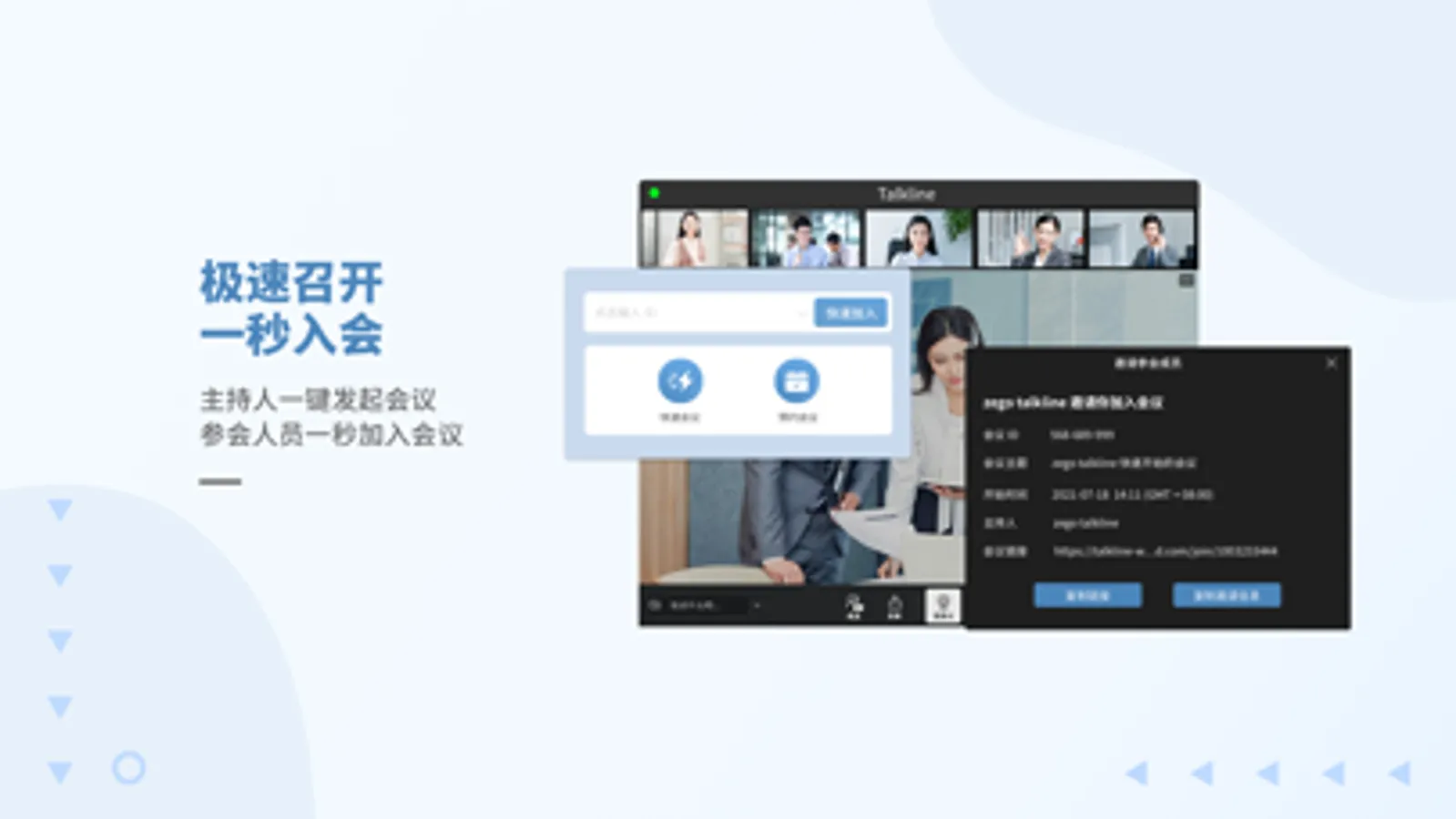 TalkLine,由即构科技自主研发的面向全球个人和企业的云视频会议软件,提供低延迟高质量的音视频服务和完善的实时共享与互动协作能力,从云到端快速部署,全终端支持企业办公、远程招聘、企业培训、在线教育、远程会诊、视频客服等多种场景。