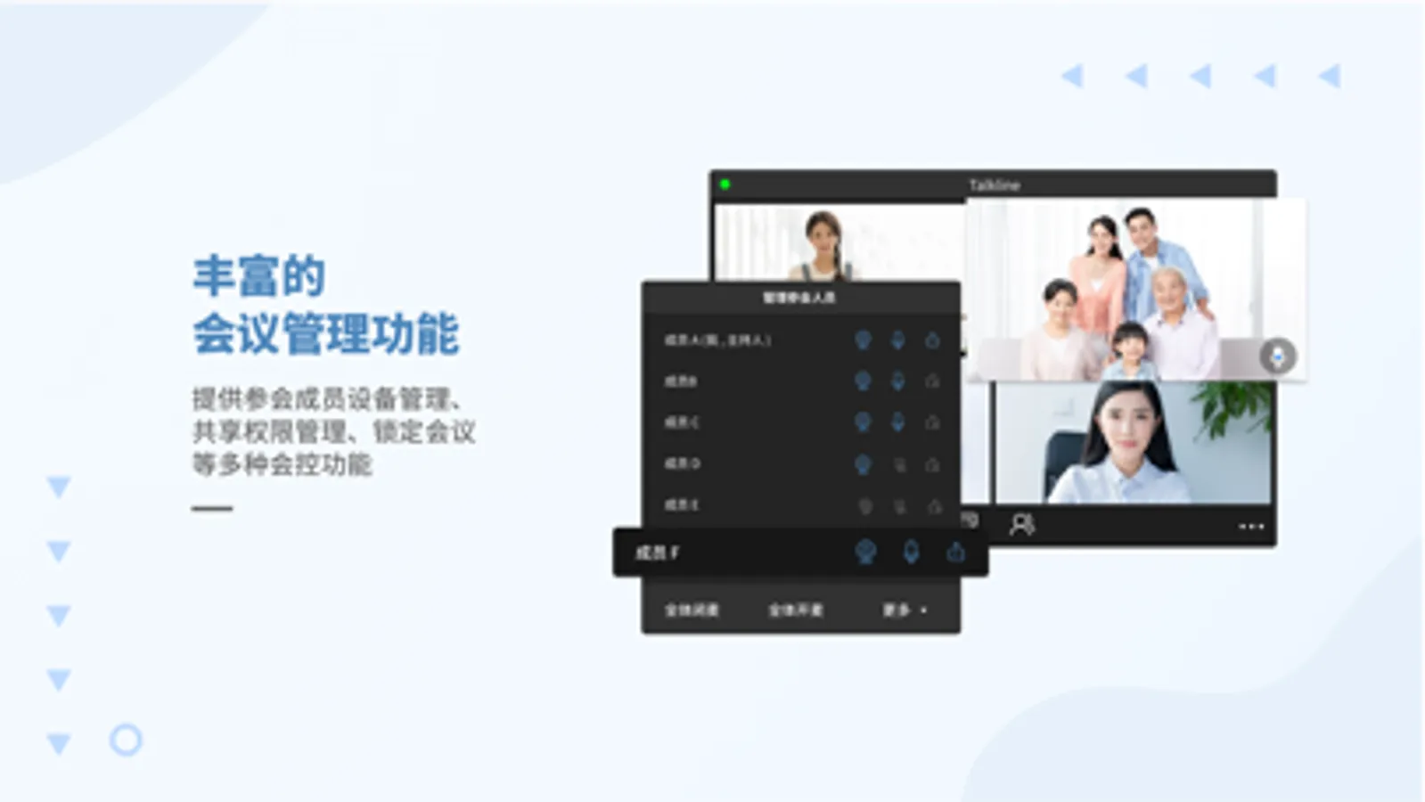 提供参会成员管理、设备管理、共享权限管理、锁定会议等多种会控功能,让会议更加安全有序。