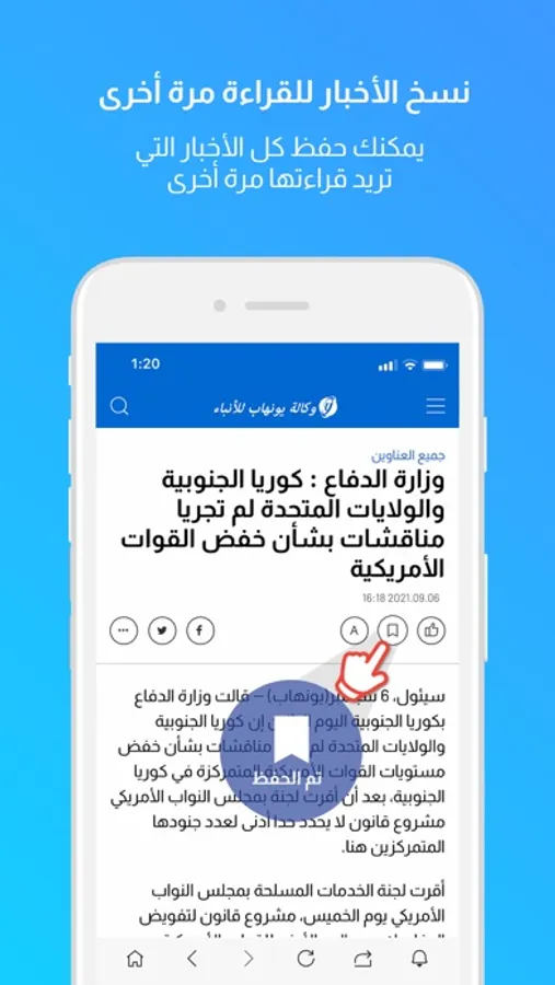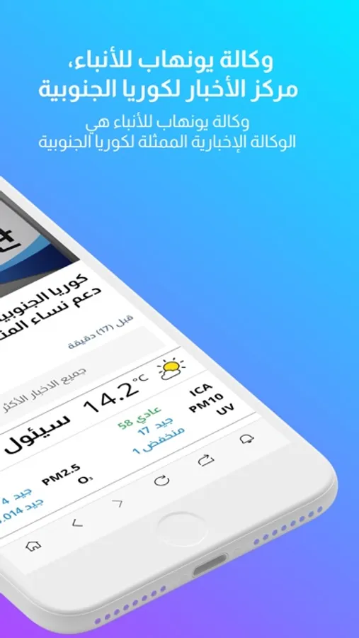 هذه الخدمة هي نسخة اللغة العربية لتطبيق وكالة يونهاب للانباء ، وكالة أنباء رئيسة في جمهورية كوريا. وتقوم وكالة يونهاب للانباء بنقل الاخبار والاحداث التي تحدث داخل وخارج كوريا على مدار الساعة طوال العام وذلك بأكثر سرعة وأكثر دقة. وتقدم الوكالة أحدث الاخبار السياسية والاقتصادية والاجتماعية والثقافية والرياضية وأخبار الامواج الثقافية الكورية بالاضافة الى الاخبار العاجلة. ويمكنك ان تتلقى الاخبار العاجلة والاخبار الرئيسة عبر ضبط ارسال التنبيه.
