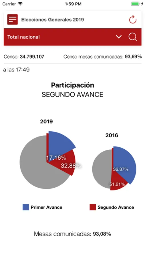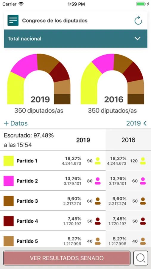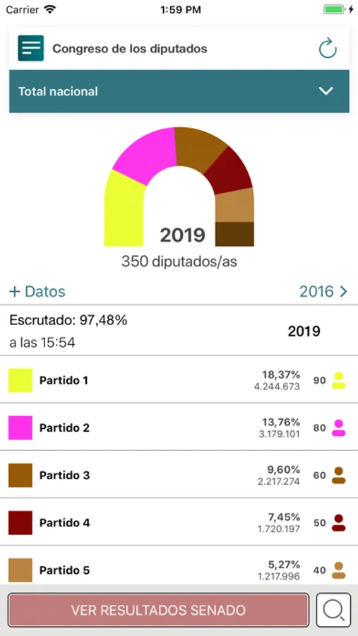 “28A Elecciones Generales España 2019” es la aplicación oficial y gratuita que el Ministerio del Interior pone a disposición de los ciudadanos para consultar los resultados provisionales de las elecciones a Cortes Generales del 28 de Abril de 2019 en España. Permite consultar en tiempo real los resultados provisionales obtenidos por todas las candidaturas por ámbito geográfico (Total Nacional, Comunidad Autónoma, Provincia, Isla, Municipio y distrito), tanto en las elecciones al Congreso de los diputados como en las elecciones al Senado. También muestra información comparativa entre los resultados de las elecciones de 2016 y 2019.