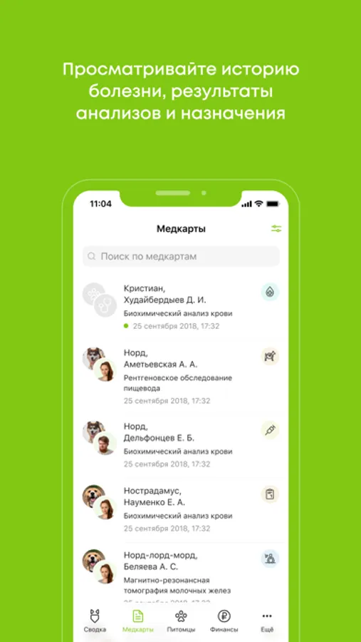 Медицинские карты с историей посещений и назначениями: все приёмы, история болезни, заключения докторов, назначения и рекомендации с момента регистрации отсортированы в хронологическом порядке.