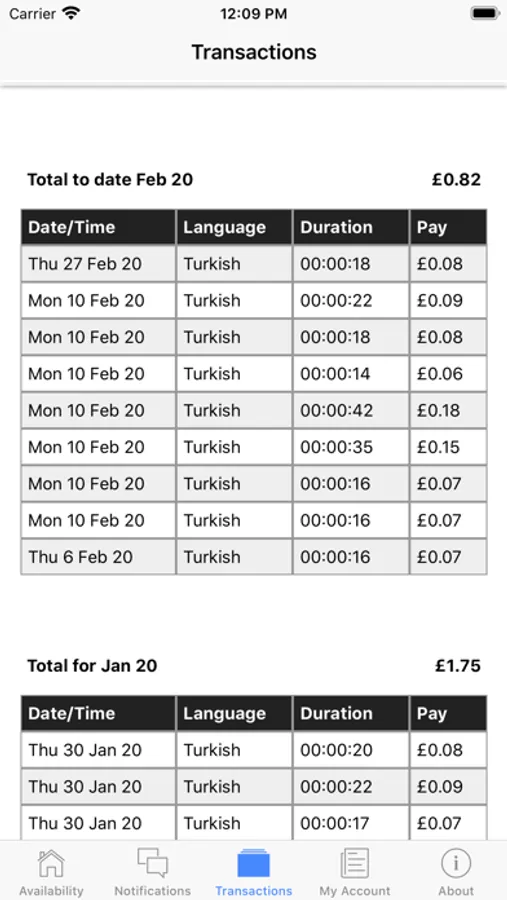 The CVInterpreter App allows Interpreters to manage their availability from their mobile phone. The App also allows Interpreters to view their account details and the transactions for the last month.