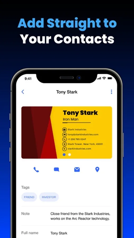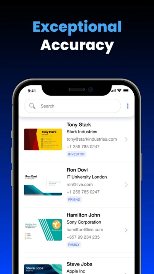 "Just exceptional, a photo and everything fills in automatically. I bought the full version and really great. In addition, you can export in csv format, what a time saver! We tag keywords and we easily find the contact. Thank you!"