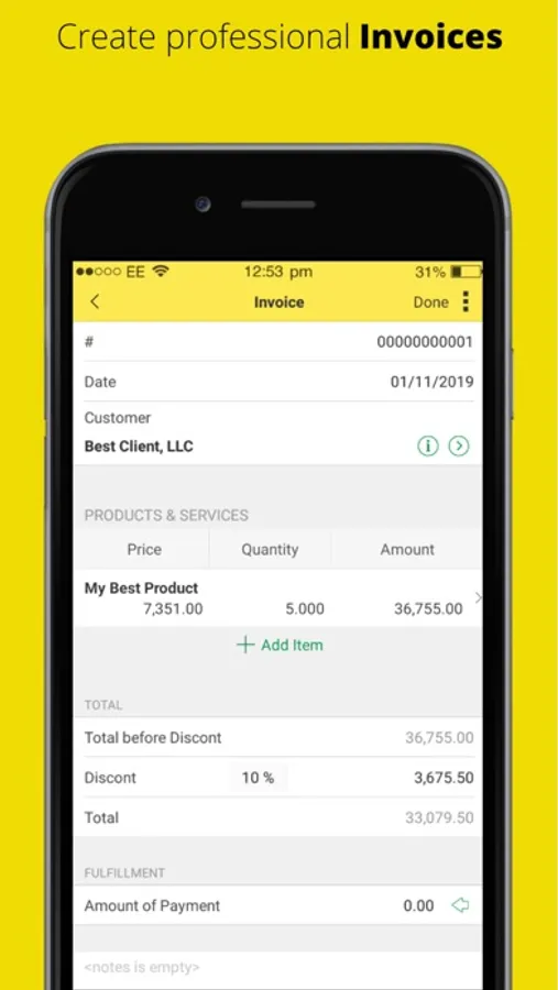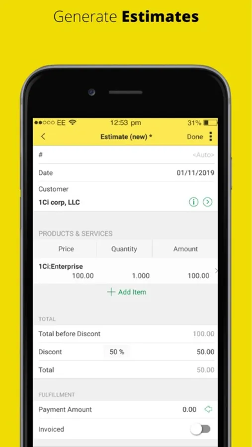 Send an invoice or estimate directly from the client. Our mobile app is perfect for on-the-go invoicing. Enter all the details you need, including tax, discounts, and more. Save items for faster invoicing later.