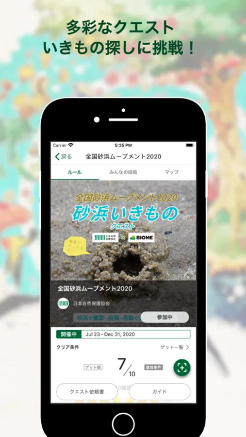 設定されたテーマに沿ったいきものを期間内に発見・投稿してクリアを目指す『クエスト』機能はゲーム性抜群。時期ごとに季節や場所などの様々な条件で出される『クエスト』に仲間と一緒にチャレンジすれば、遊びながらいきものに詳しくなることができます。