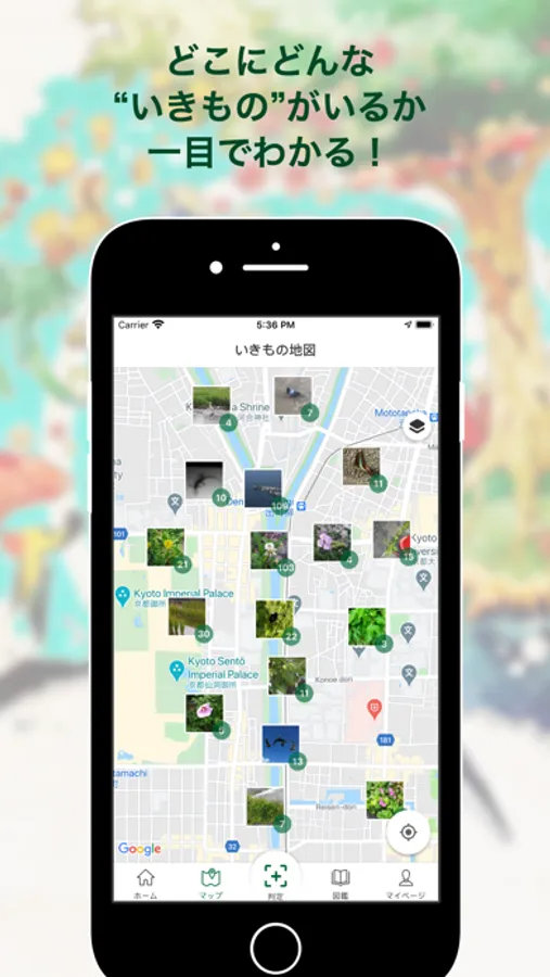 『マップ』では各場所で発見されたいきものが写真で表示(※)されていますので、「この場所にはこんないきものがいるんだ!」という知る楽しみ、外に出たくなるワクワク感を味わうことができます。