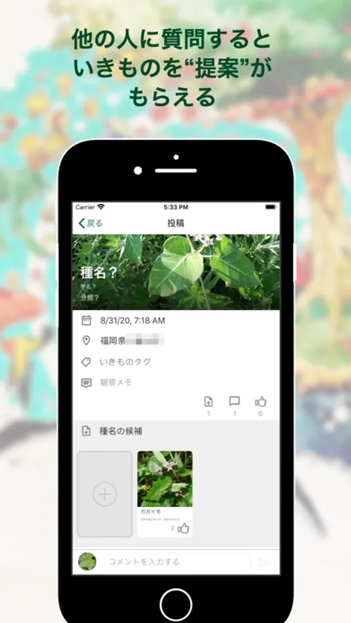 見つけたいきものは他のユーザーに公開してみよう!『いいね!』をしたり、コメントし合ったり、いきものを見つけたときの嬉しい!楽しい!をユーザー同士で共有し合うことができます。他のユーザーの『しつもん投稿』に種名を提案してみて、わいわい議論するのも楽しみ方のひとつです!