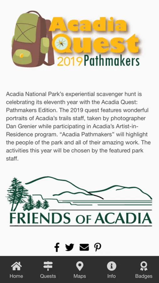 Acadia Quest sends you on adventures through Acadia National Park! Explore the app to meet the people and places of the park and discover where to collect your digital badges along the trail. Acadia Quest is a program of Friends of Acadia and free to all, but teams will need a park pass to participate. Friends of Acadia preserves, protects, and promotes stewardship of the outstanding natural beauty, ecological vitality, and distinctive cultural resources of Acadia National Park and surrounding communities for the inspiration and enjoyment of current and future generations.