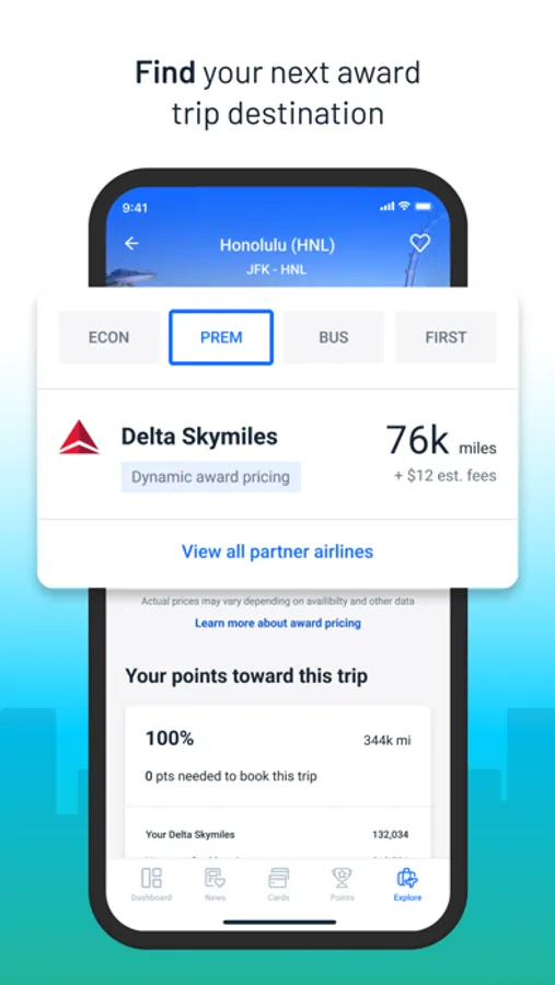 Get to your next destination sooner: See how many points and miles it’ll take to get to any destination from your home airport, and track your progress towards making saved trips a reality.