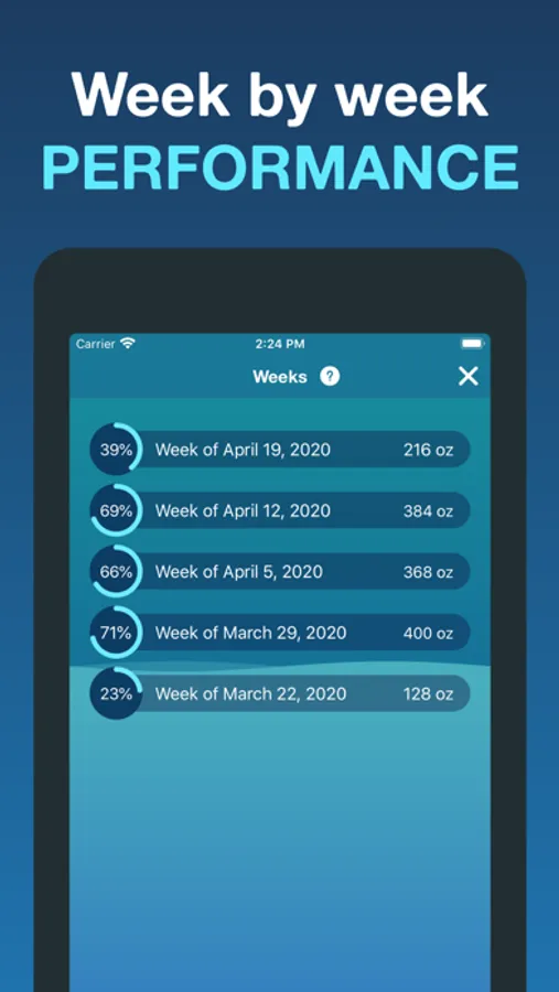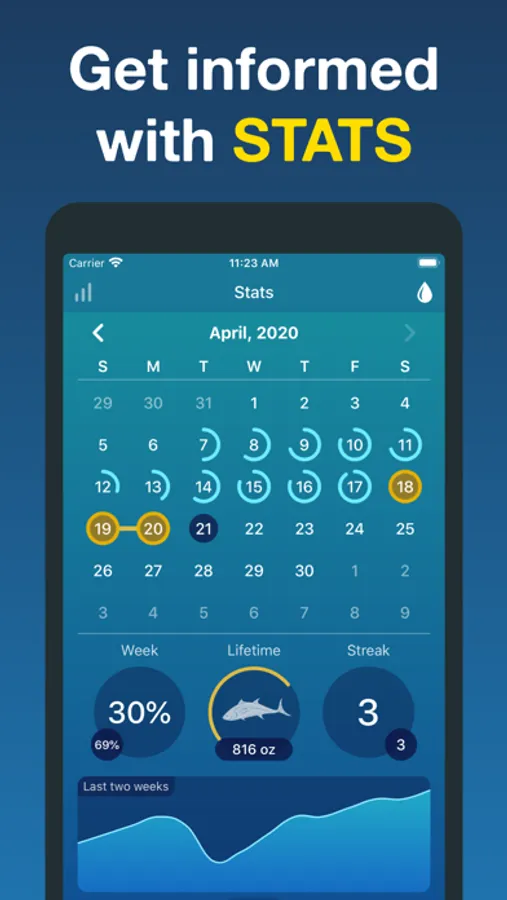 See a variety of insightful stats about your hydration: Streaks, Weekly Performance, Lifetime Water Drank, and an elegant Graph showing your hydration level over the past two weeks.