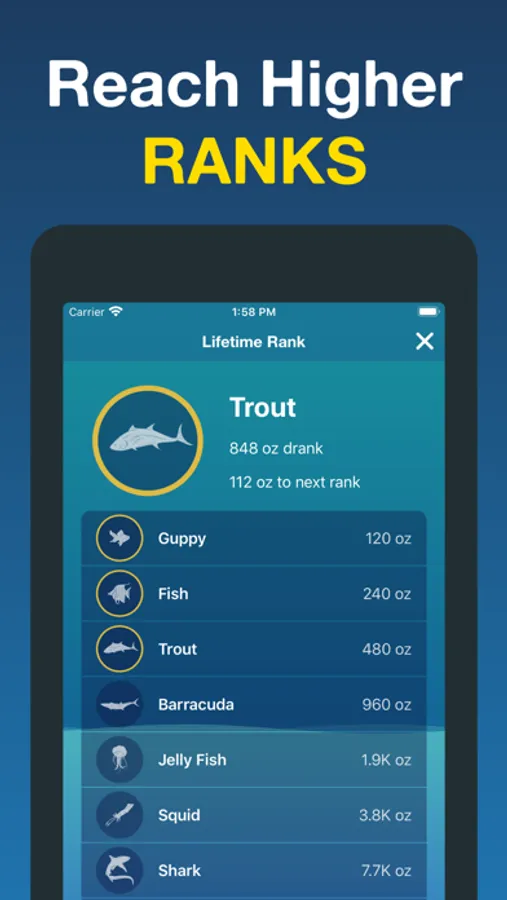 As you drink more and more water, you elevate your status from a bubble all the way up to some of the biggest most powerful creatures in the ocean.