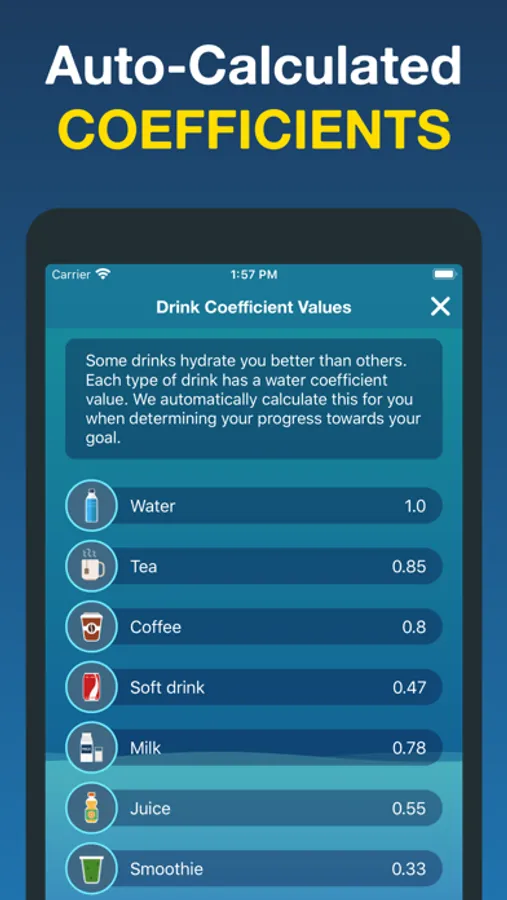 Record various types of drinks. The app will automatically calculate how much actual water was in the drink. Some drinks such as alcohol, actually dehydrate you.